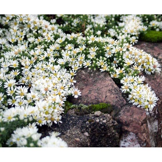 Plazivá astra tvoriaca veľké koberce drobných bielych kvetov